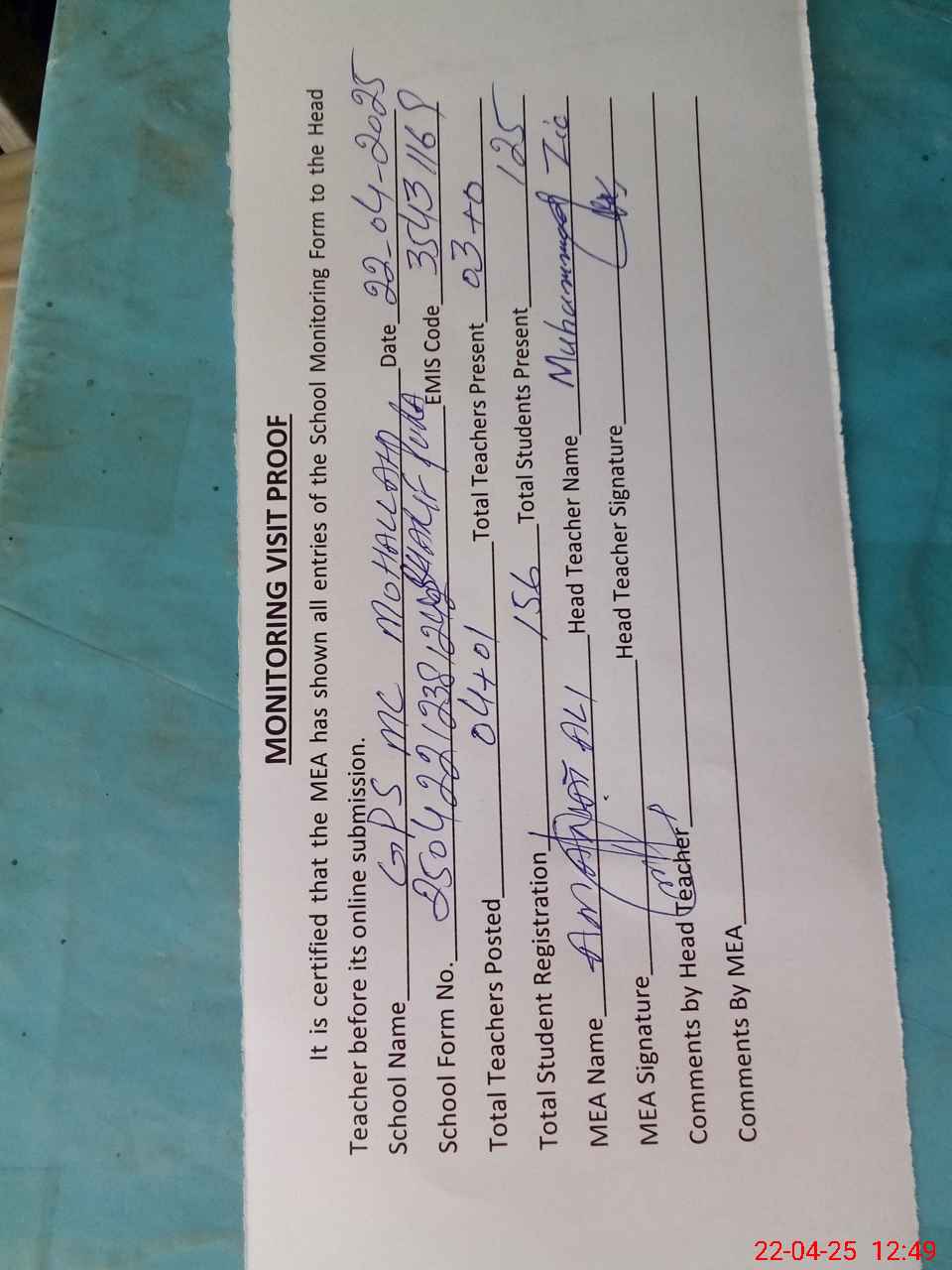 | Attendance Register | Head Teacher | MEA with School | Visit Proof |
