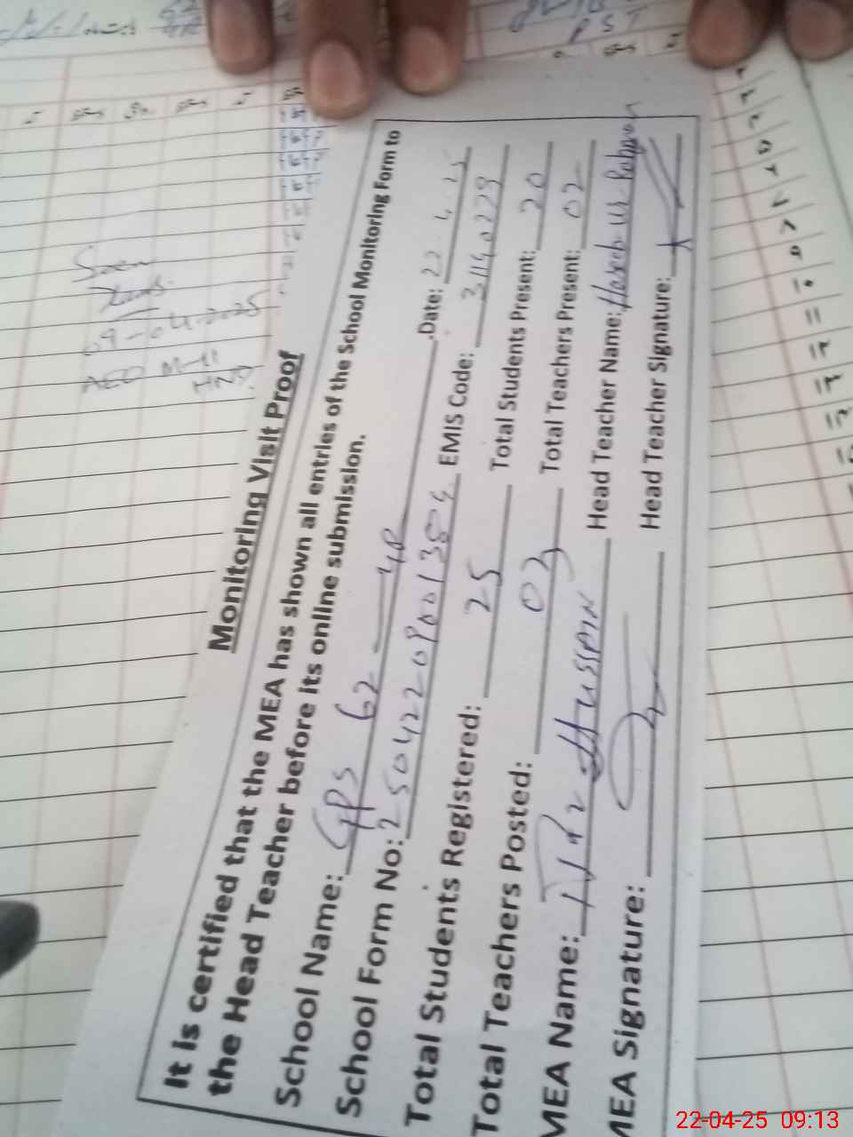 | Attendance Register | Head Teacher | MEA with School | Visit Proof |