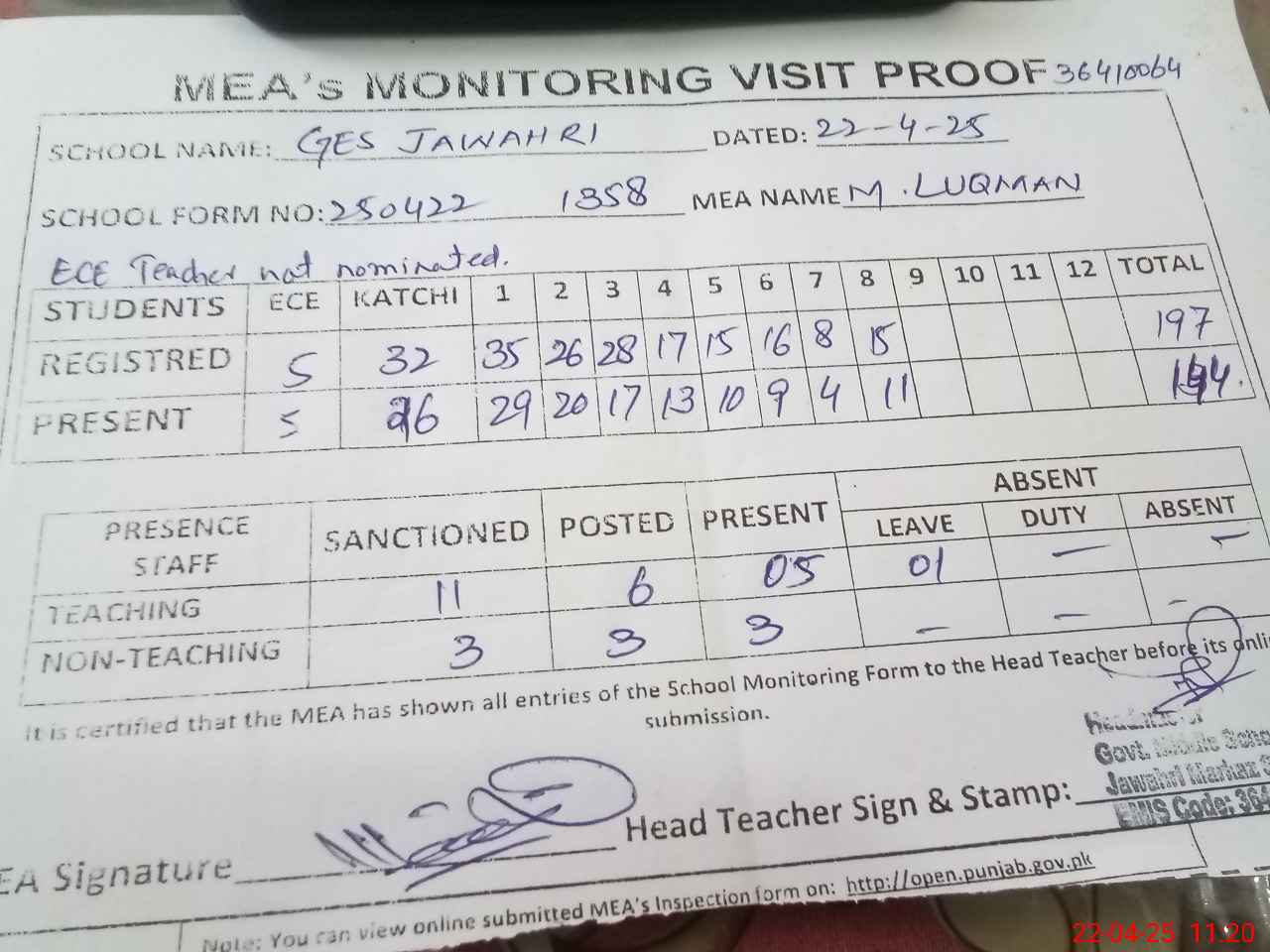 | Attendance Register | Head Teacher | MEA with School | Visit Proof |