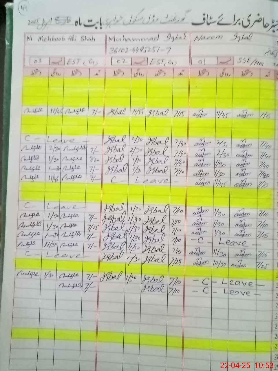| CNIC | Full Name | Designation | R/C | Absence During Last Calender Month |