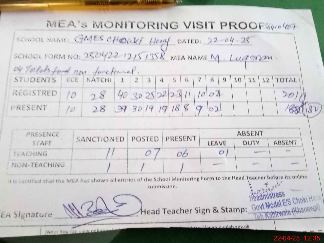 | Attendance Register | Head Teacher | MEA with School | Visit Proof |