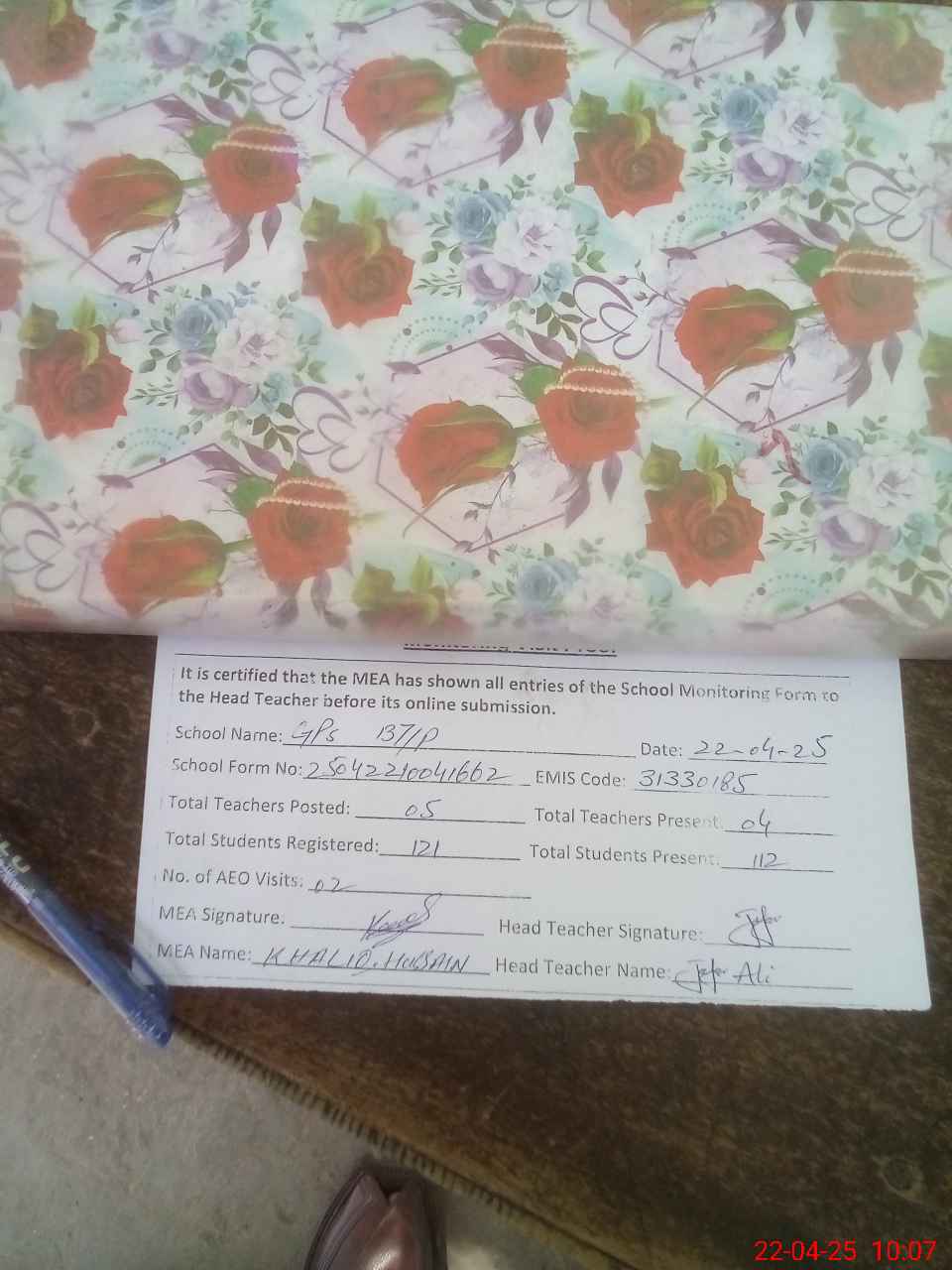 | Attendance Register | Head Teacher | MEA with School | Visit Proof |