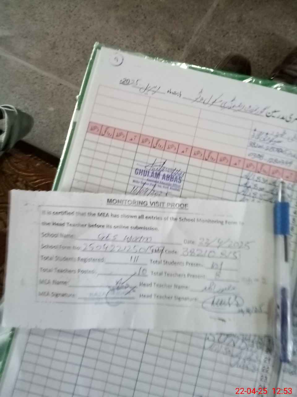 | Attendance Register | Head Teacher | MEA with School | Visit Proof |
