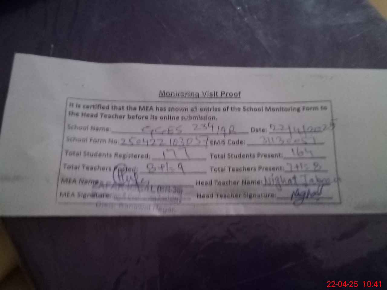 | Attendance Register | Head Teacher | MEA with School | Visit Proof |