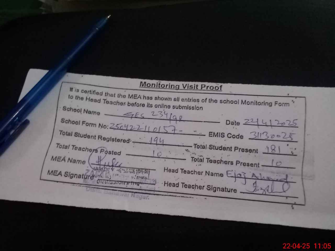 | Attendance Register | Head Teacher | MEA with School | Visit Proof |