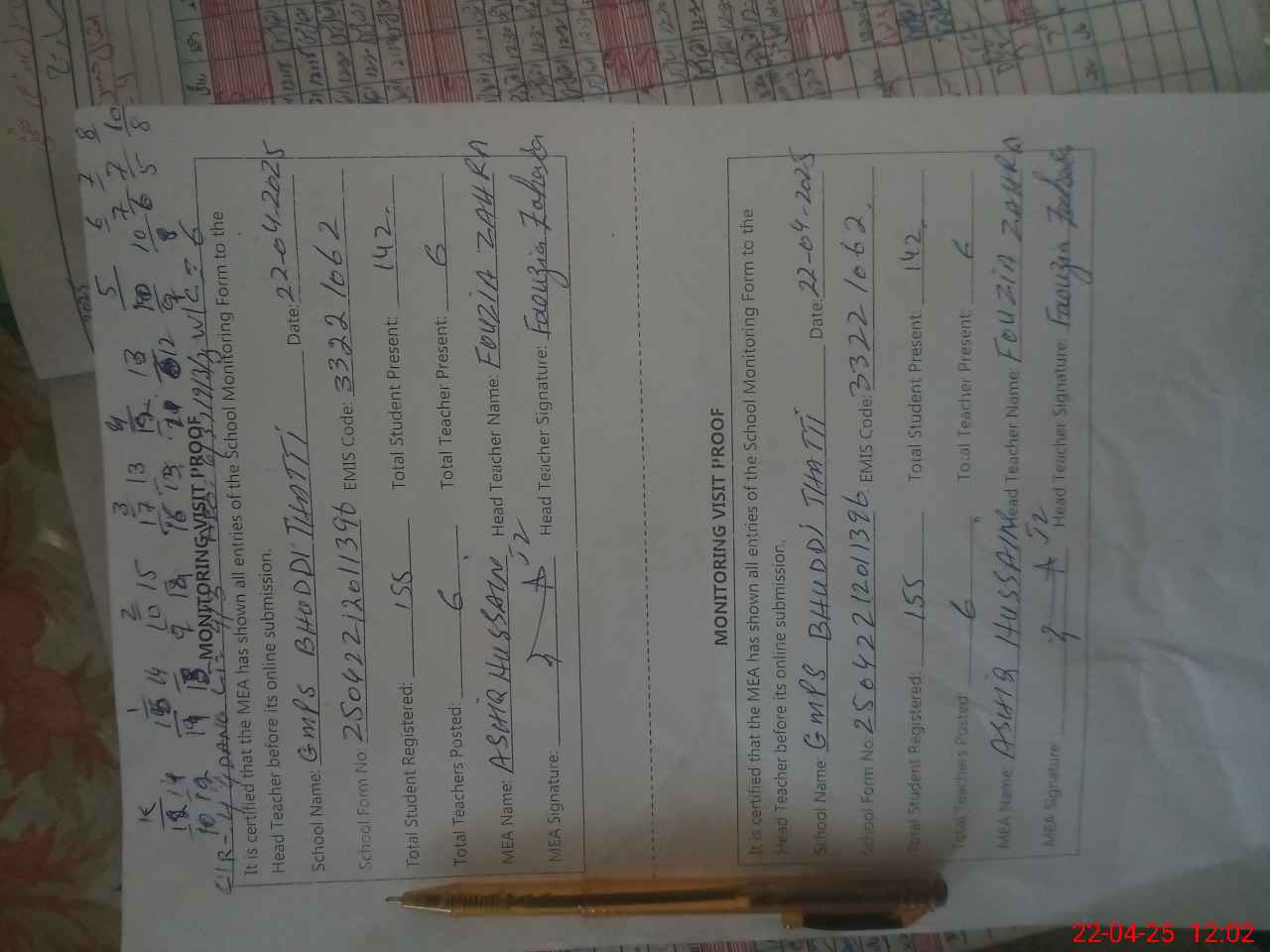 | Attendance Register | Head Teacher | MEA with School | Visit Proof |
