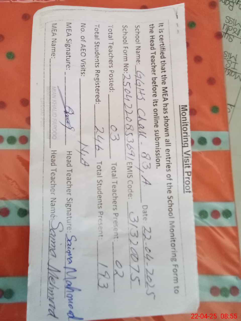 | Certified that this School was Inspected by the Undersigned MEA/DMO Today and the Information Stated Above is as Per Record. | |||||