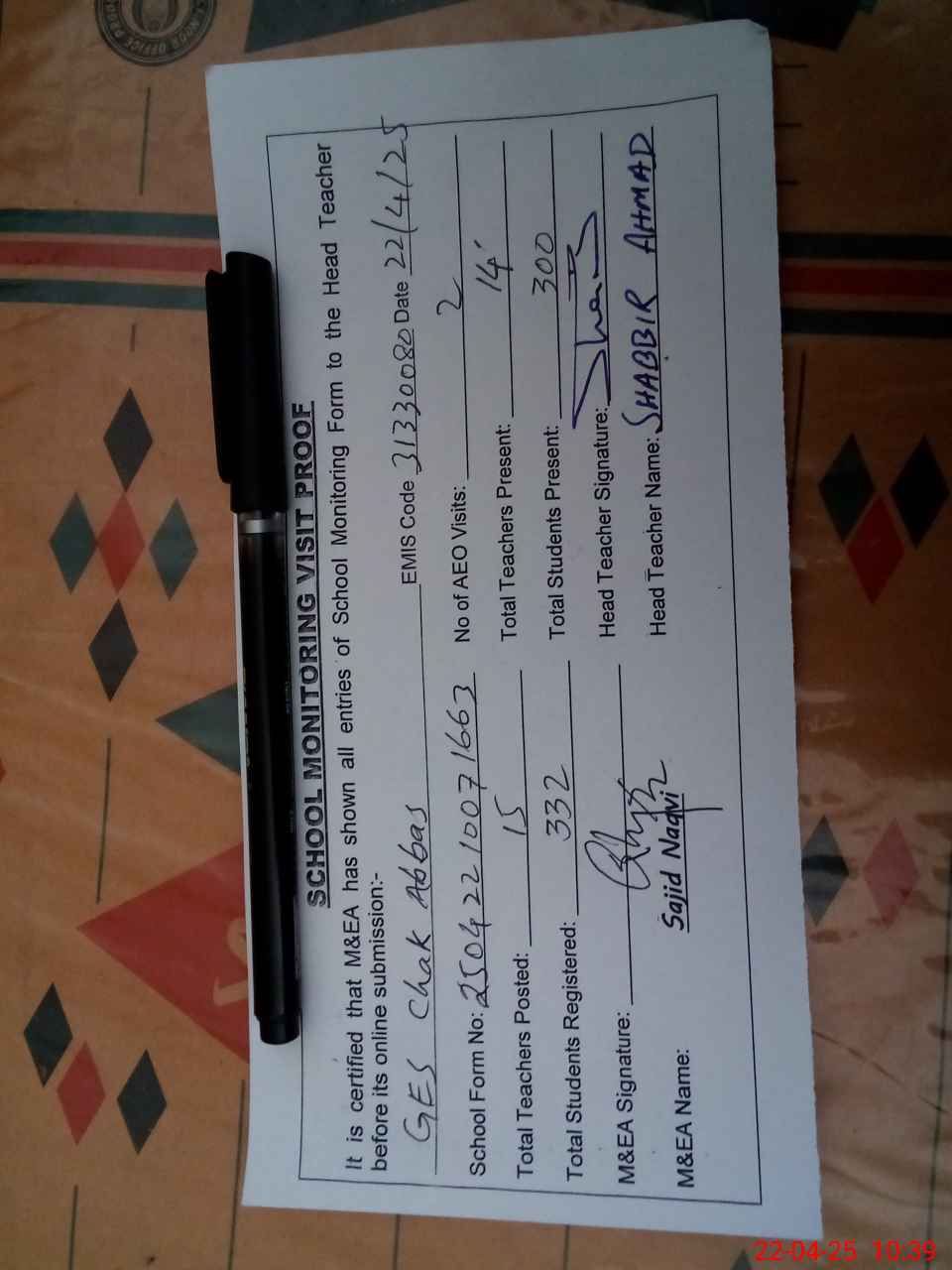 | Attendance Register | Head Teacher | MEA with School | Visit Proof |