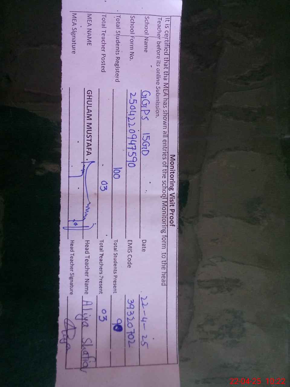 | Attendance Register | Head Teacher | MEA with School | Visit Proof |