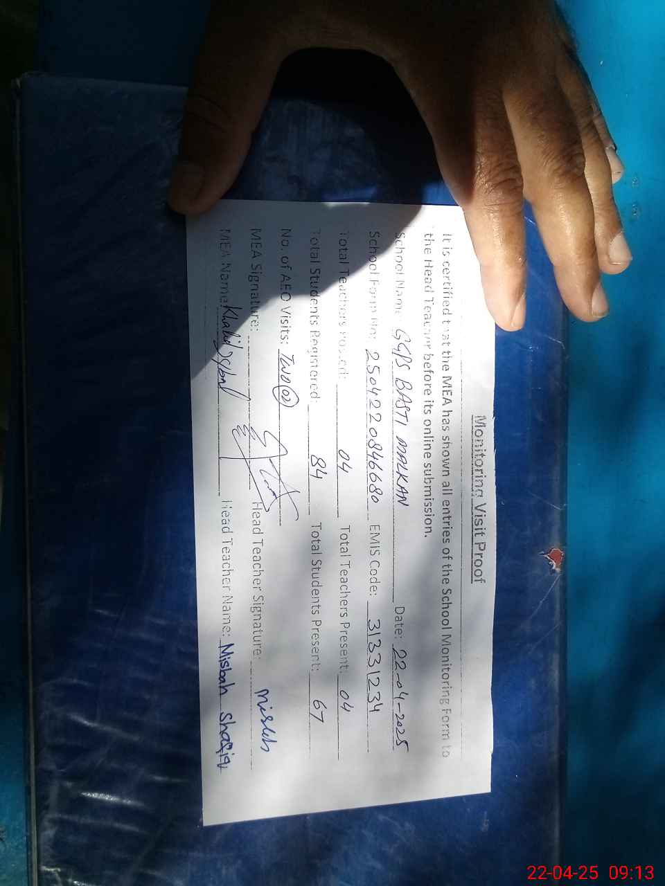 | Remarks (Use Separate Page if Required): Class verification is not updated on mea tab as per sis and teachers attendance updated on sis today and All classes are sitting on open air and Girls Malkan school is running in GPS boys Malkan school | |||||