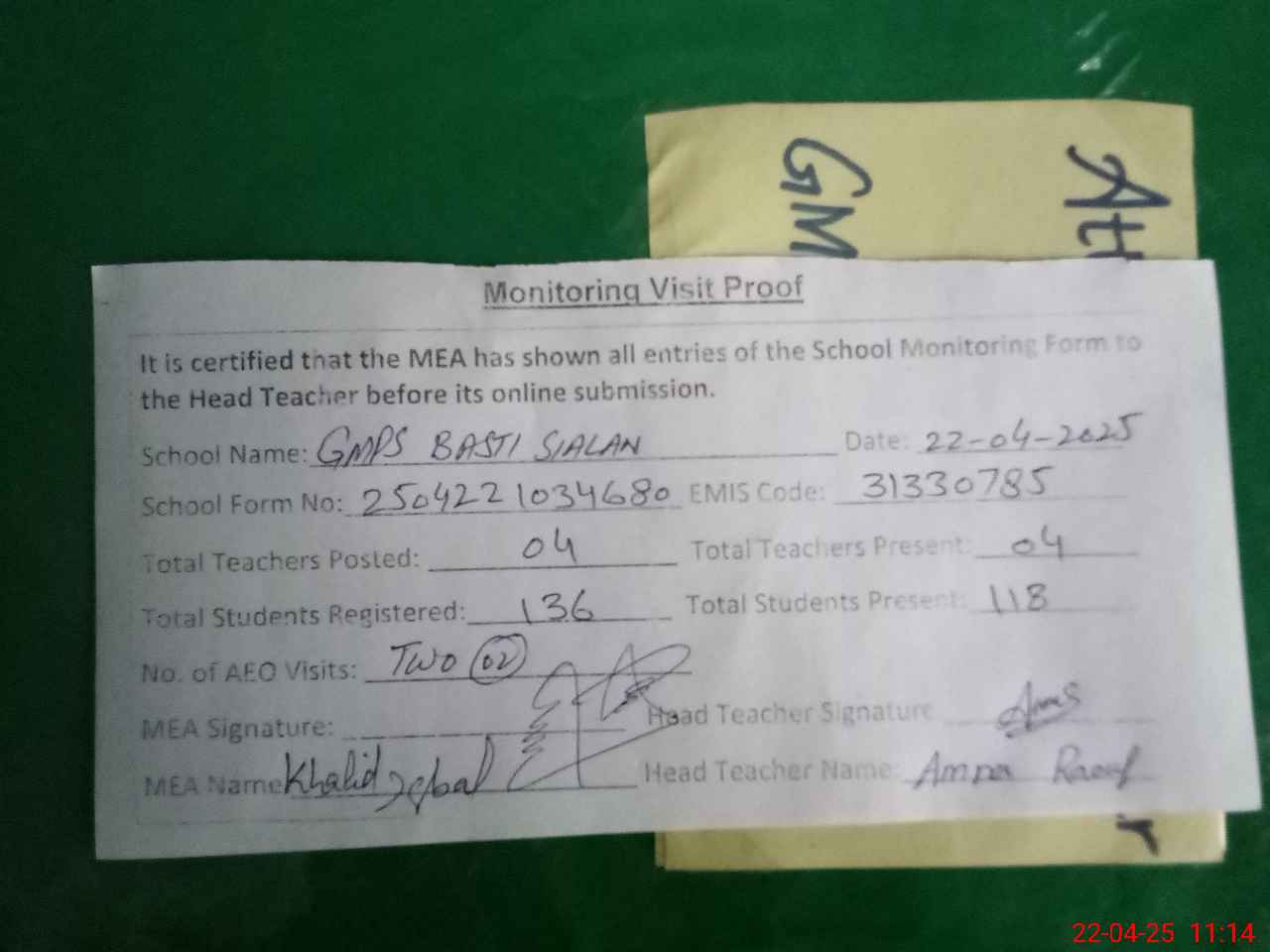 | EMIS Code: 31330785 | Name of School: GMPS BASTI SIALAN | |||