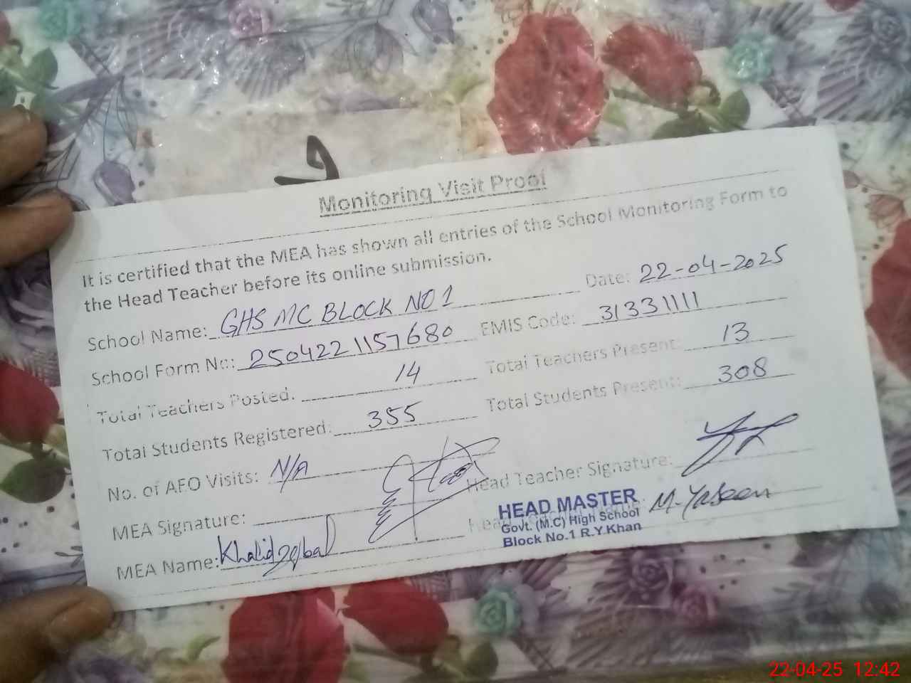 | EMIS Code: 31331111 | Name of School: GHS MC BLOCK NO. 1 | |||