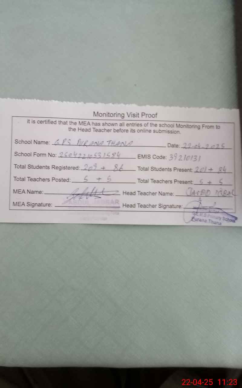 | EMIS Code: 39210131 | Name of School: GPS PURANA THANA | |||