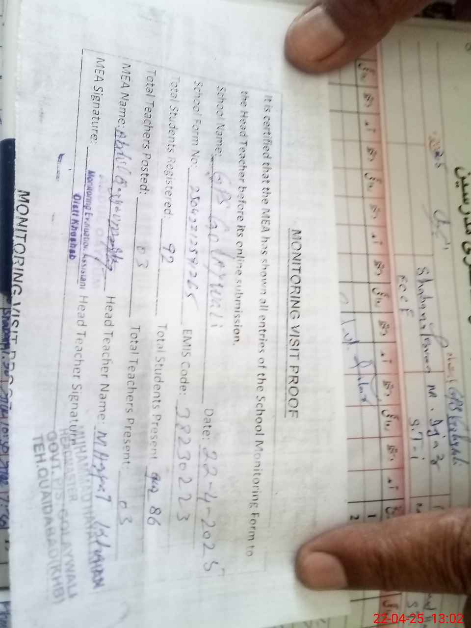 | Attendance Register | Head Teacher | MEA with School | Visit Proof |