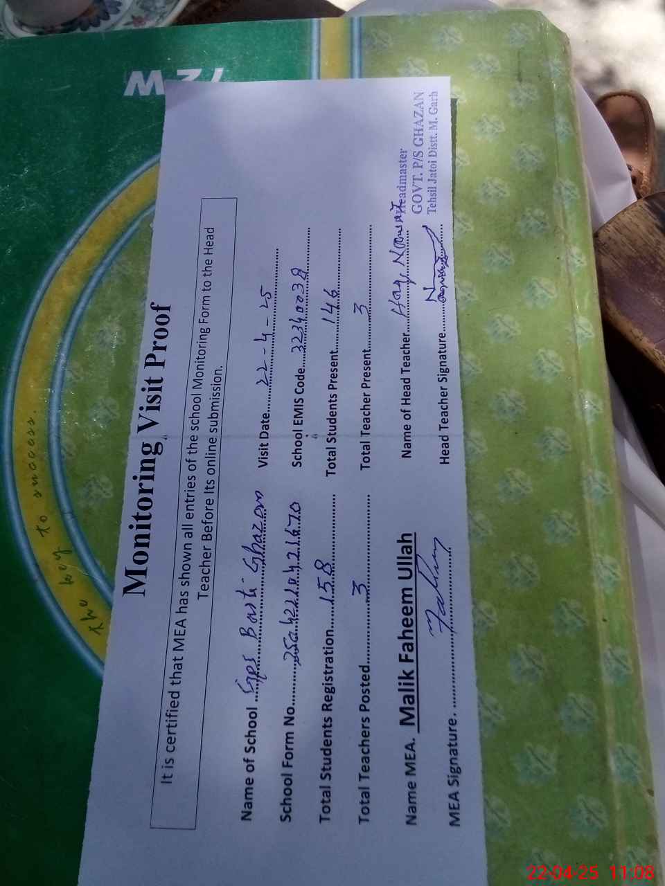 | Attendance Register | Head Teacher | MEA with School | Visit Proof |