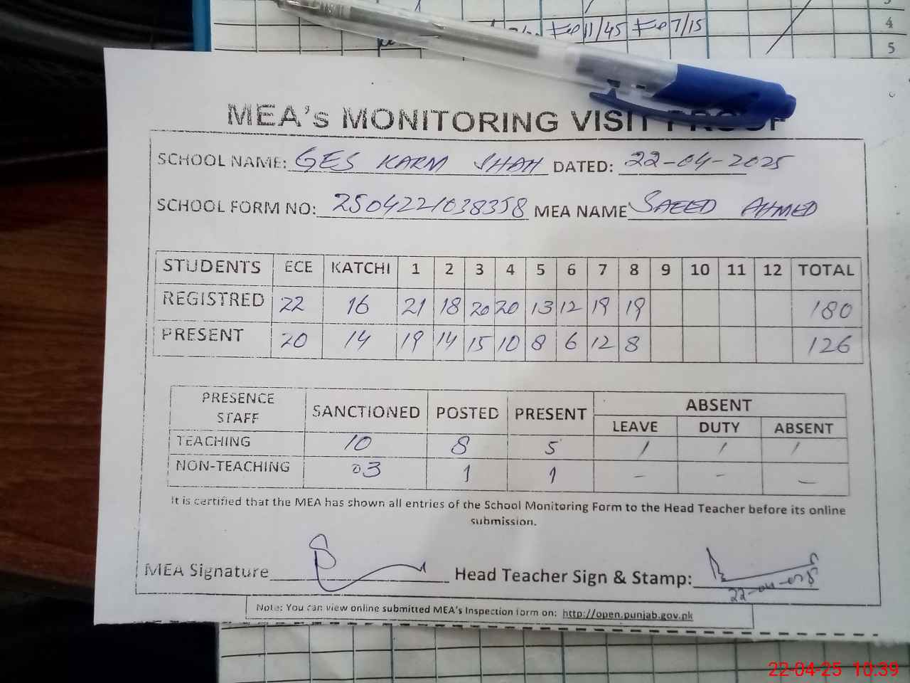 | Attendance Register | Head Teacher | MEA with School | Visit Proof |