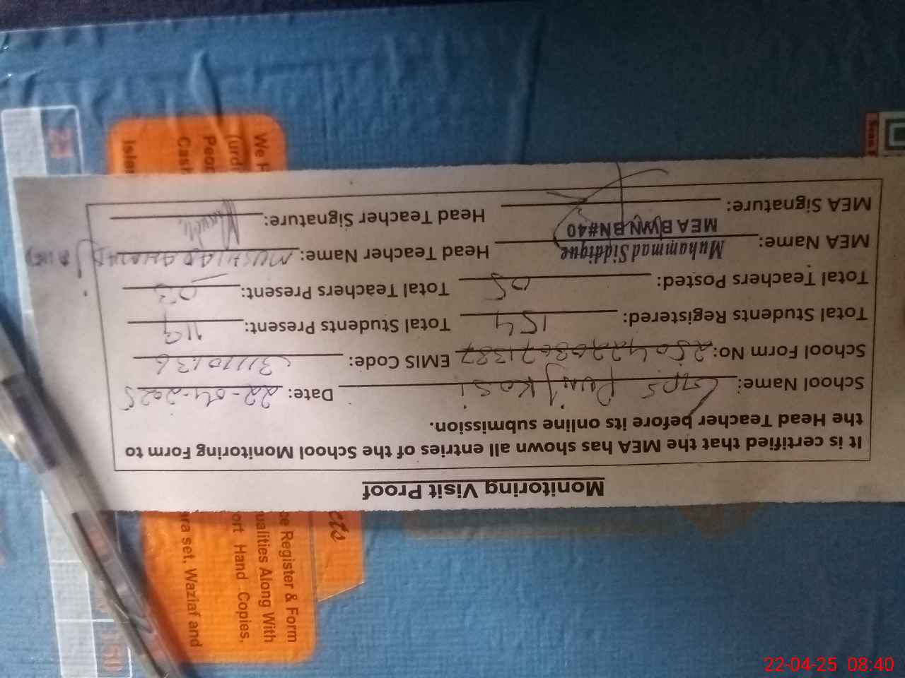 | Attendance Register | Head Teacher | MEA with School | Visit Proof |