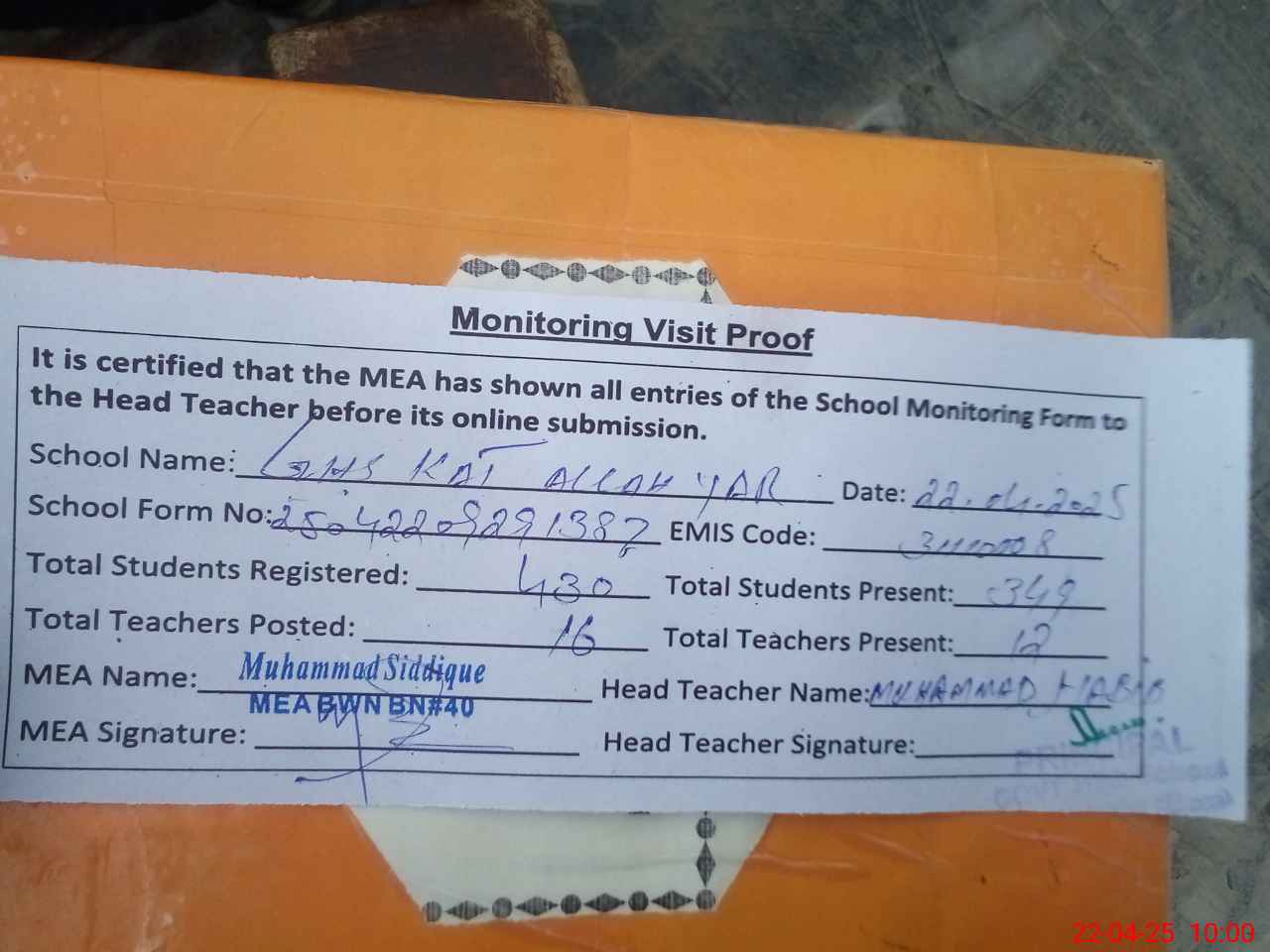 | Attendance Register | Head Teacher | MEA with School | Visit Proof |