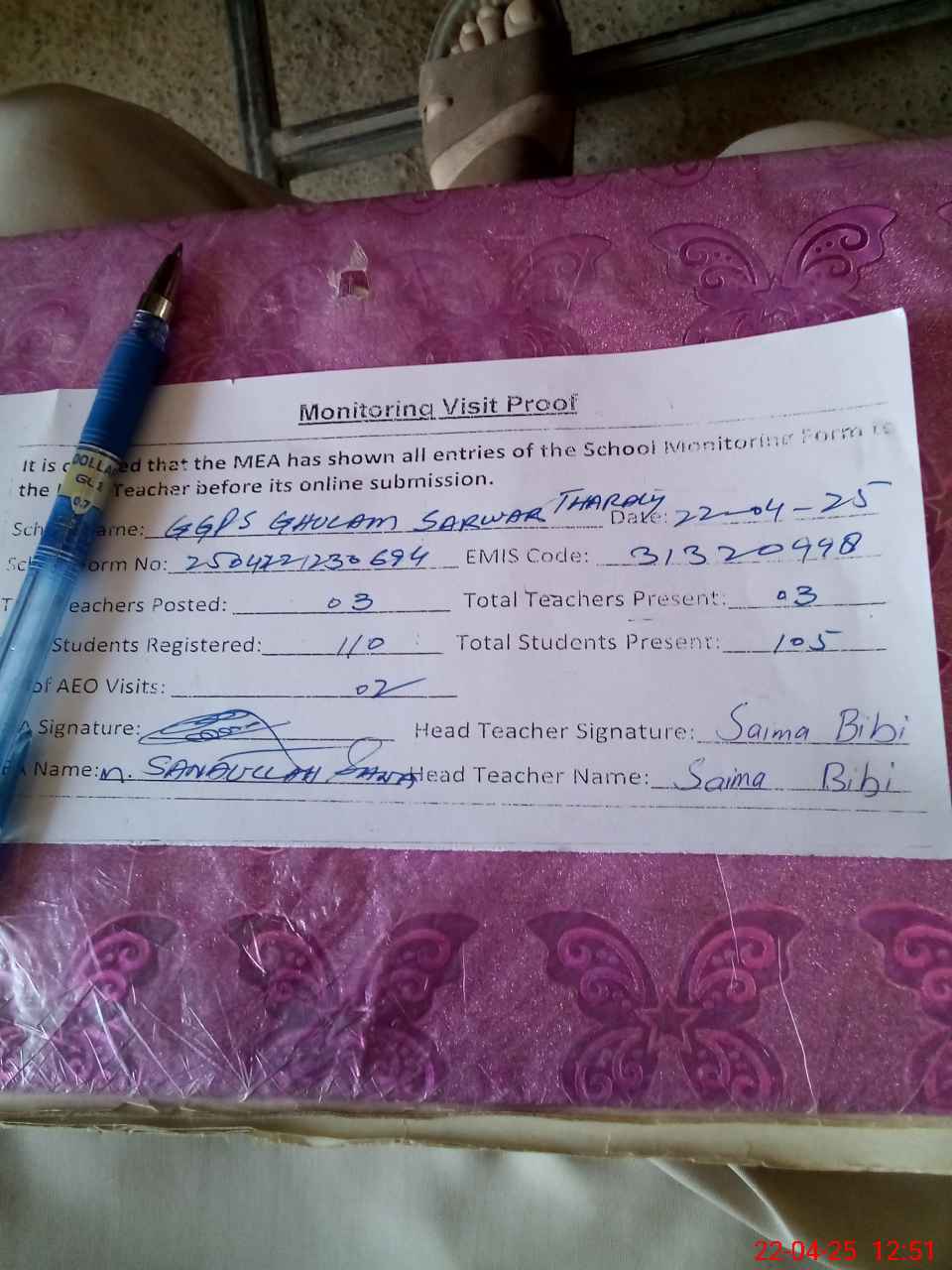 | EMIS Code: 31320998 | Name of School: GGPS GHULAM SARWAR TARHALI | |||
