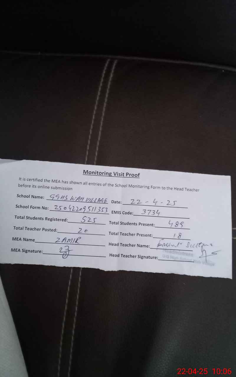| Attendance Register | Head Teacher | MEA with School | Visit Proof |