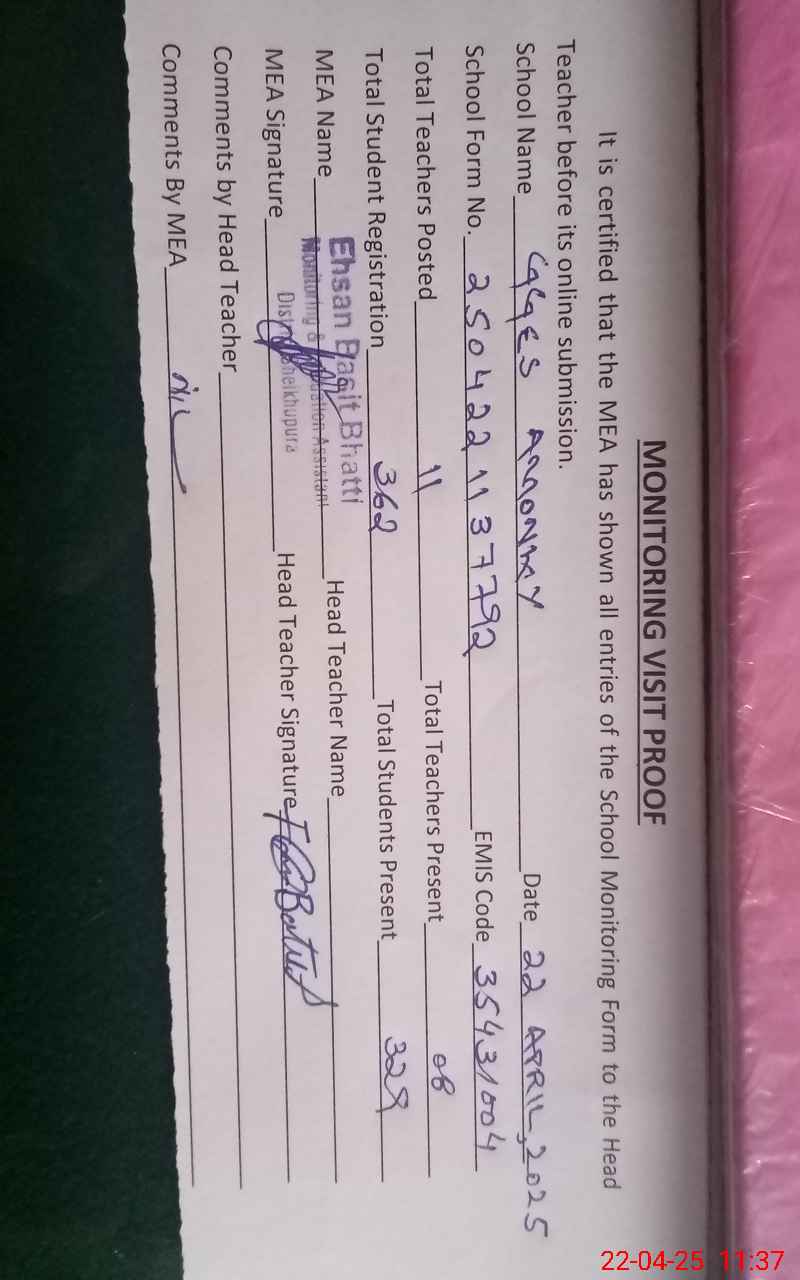 | Certified that this School was Inspected by the Undersigned MEA/DMO Today and the Information Stated Above is as Per Record. | |||||