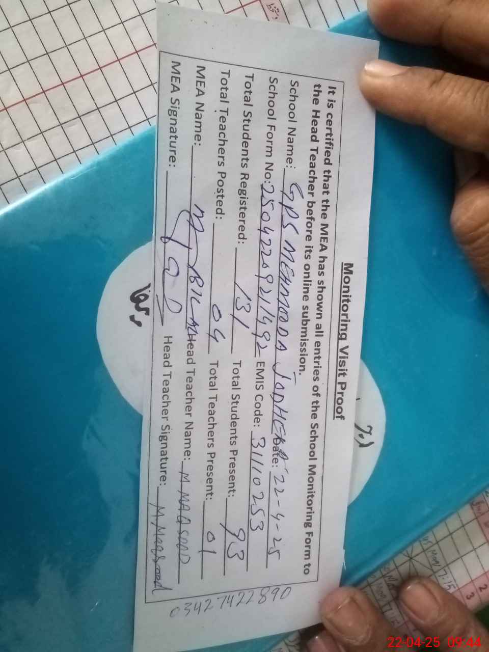| EMIS Code: 31110253 | Name of School: GPS MEHMOODA JODEKA | |||