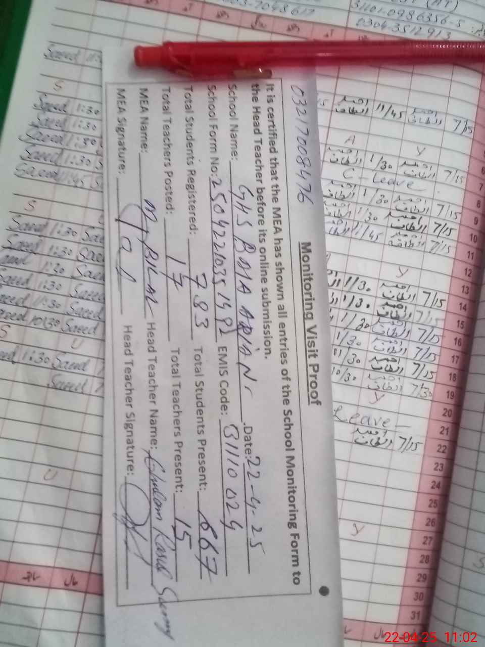 | Attendance Register | Head Teacher | MEA with School | Visit Proof |