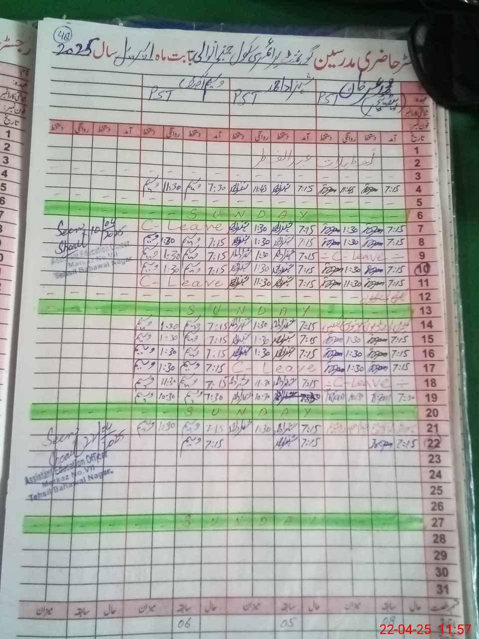 | CNIC | Full Name | Designation | R/C | Absence During Last Calender Month |