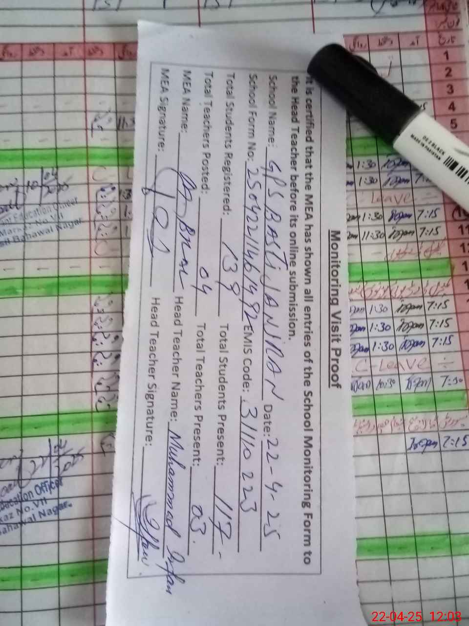 | Attendance Register | Head Teacher | MEA with School | Visit Proof |