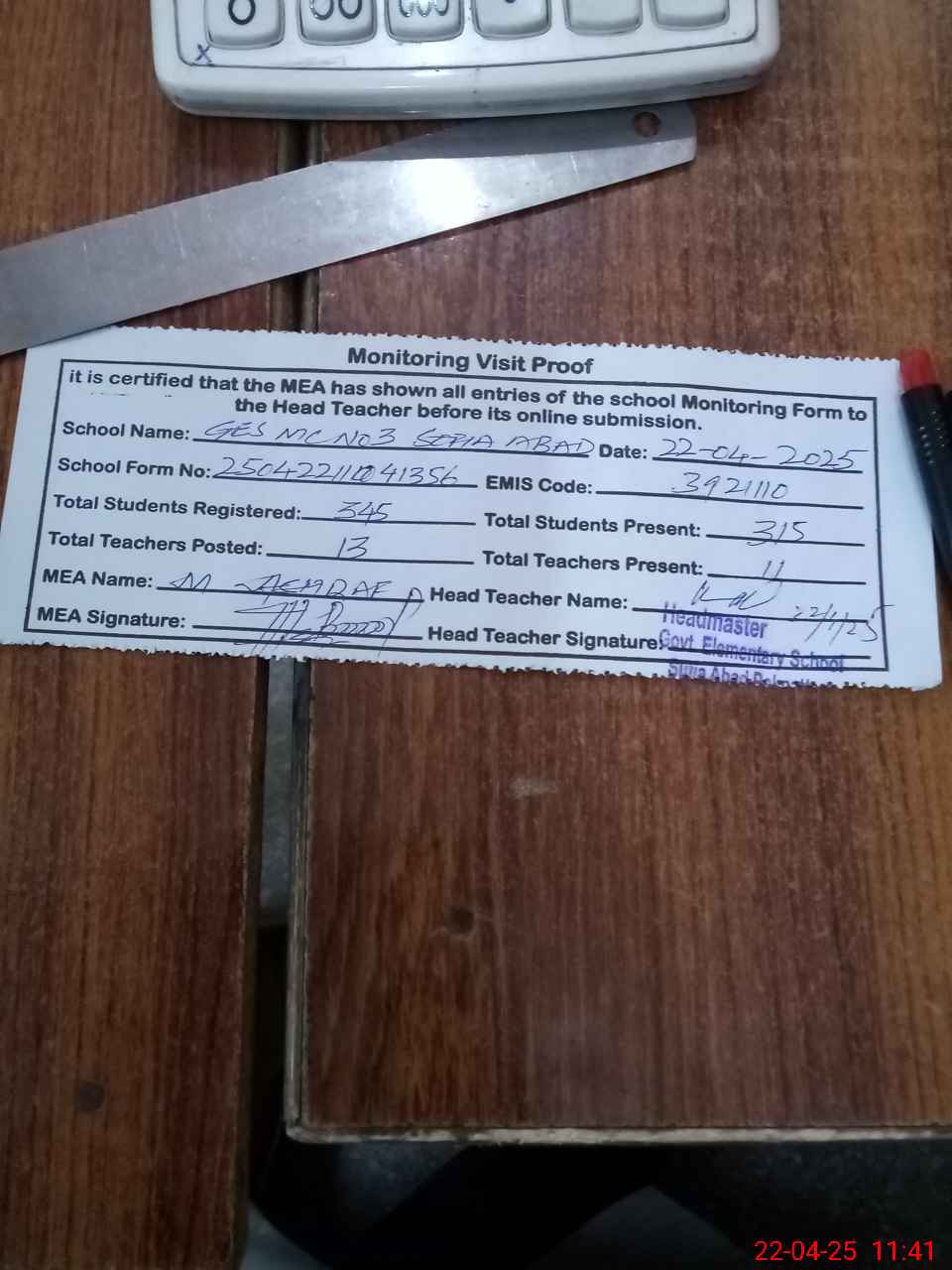 | Attendance Register | Head Teacher | MEA with School | Visit Proof |