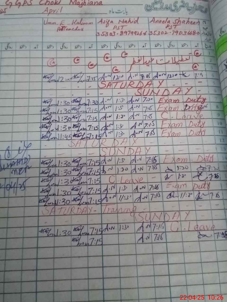 | Leave | Duty | Absent | Maternity | Medical | Ex- Pak |