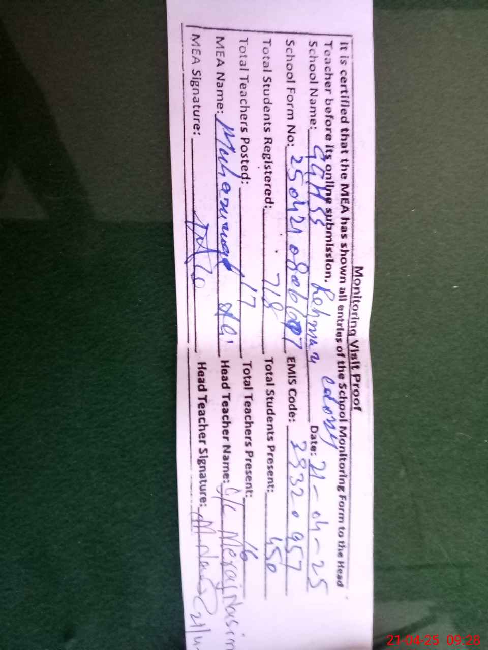 | Attendance Register | Head Teacher | MEA with School | Visit Proof |