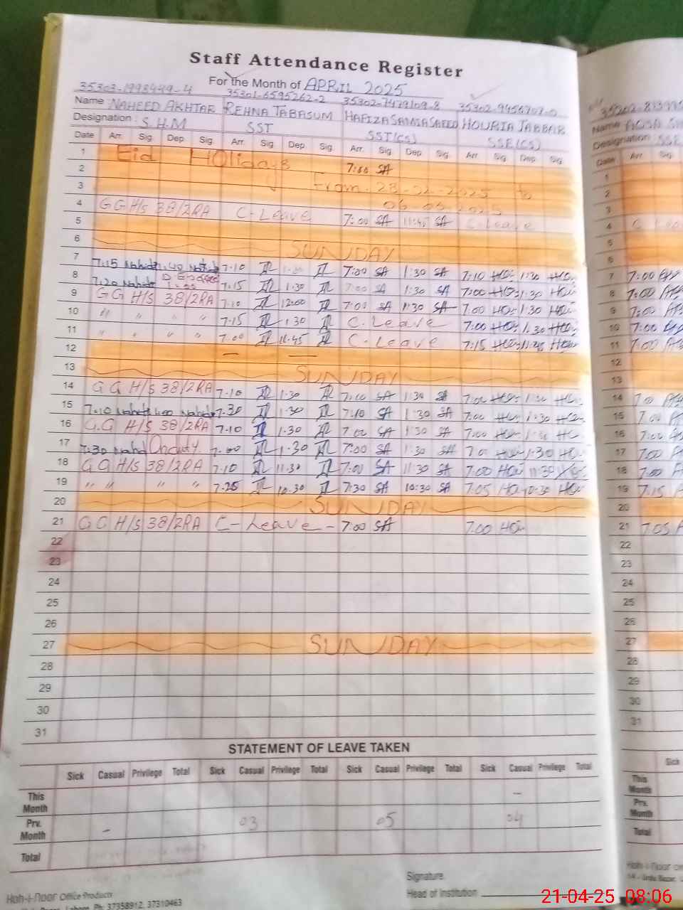 | CNIC | Full Name | Designation | R/C | Absence During Last Calender Month |