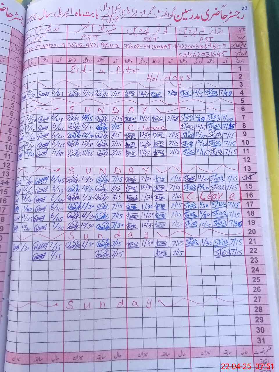 | CNIC | Full Name | Designation | R/C | Absence During Last Calender Month |