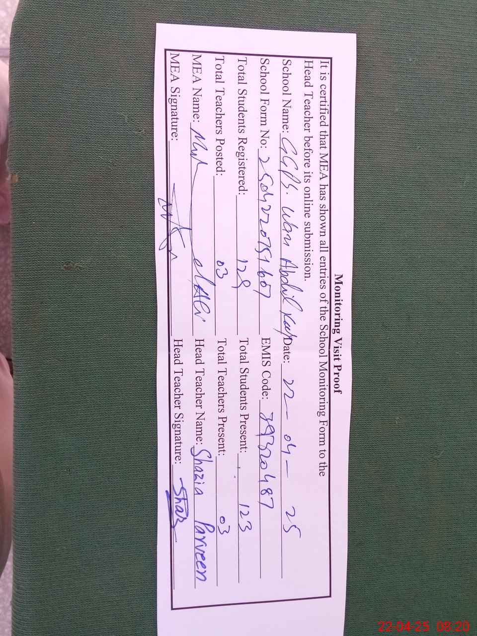 | Attendance Register | Head Teacher | MEA with School | Visit Proof |
