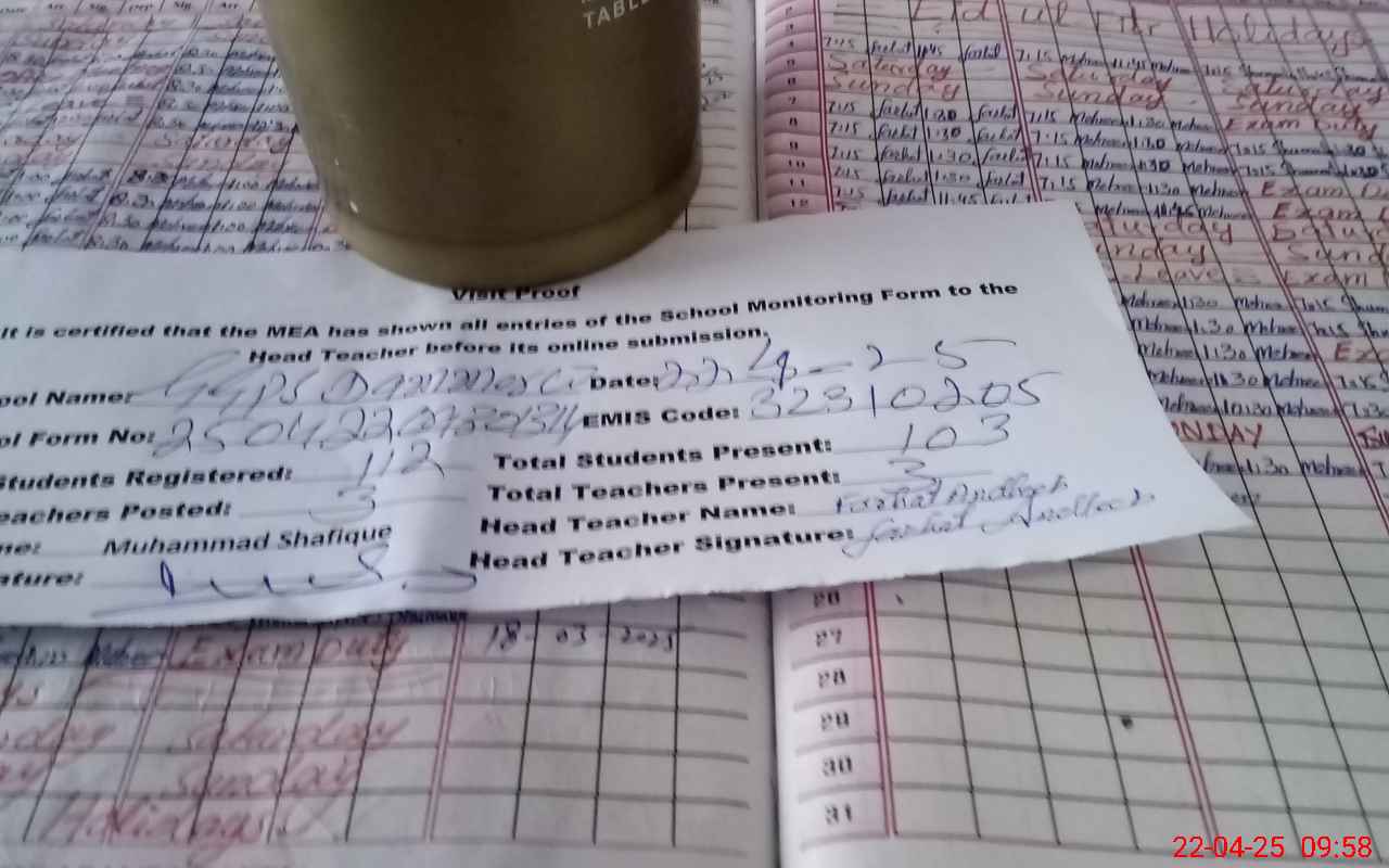| Attendance Register | Head Teacher | MEA with School | Visit Proof |