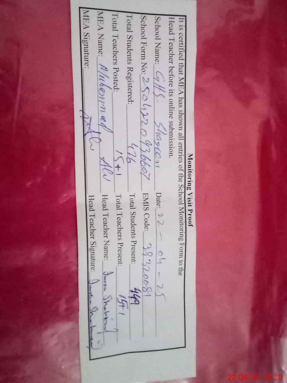 | Certified that this School was Inspected by the Undersigned MEA/DMO Today and the Information Stated Above is as Per Record. | |||||
