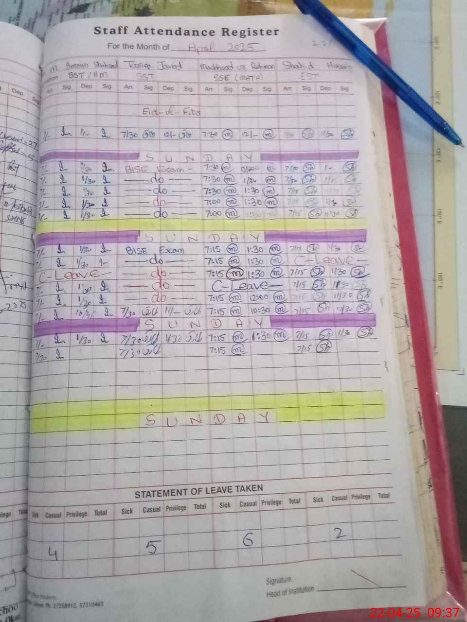 | CNIC | Full Name | Designation | R/C | Absence During Last Calender Month |