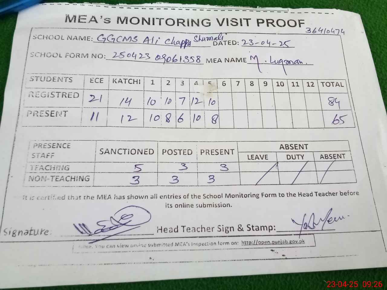 | Attendance Register | Head Teacher | MEA with School | Visit Proof |