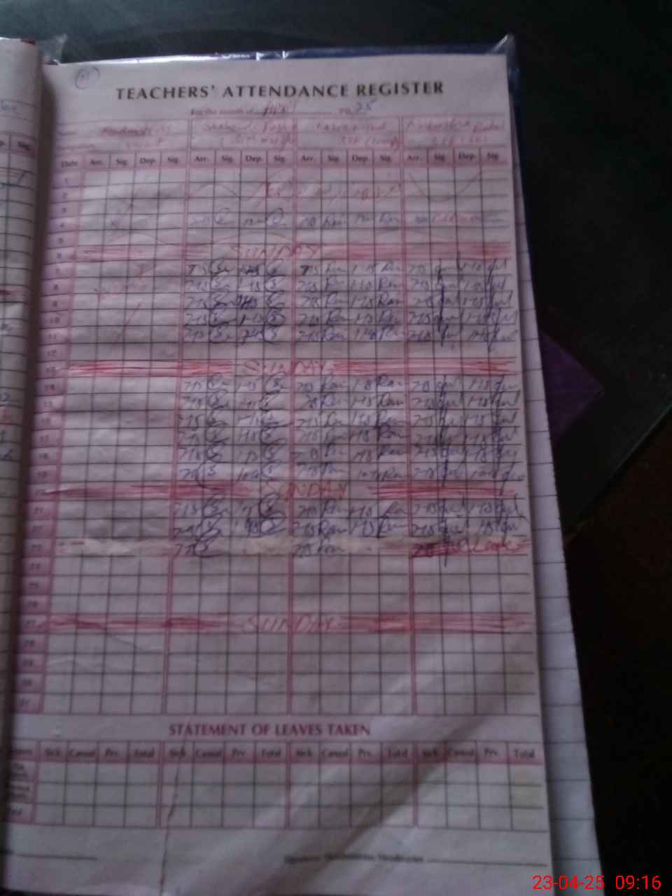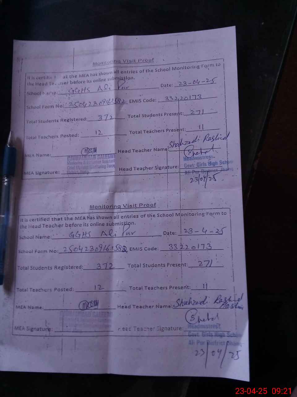 | Attendance Register | Head Teacher | MEA with School | Visit Proof |