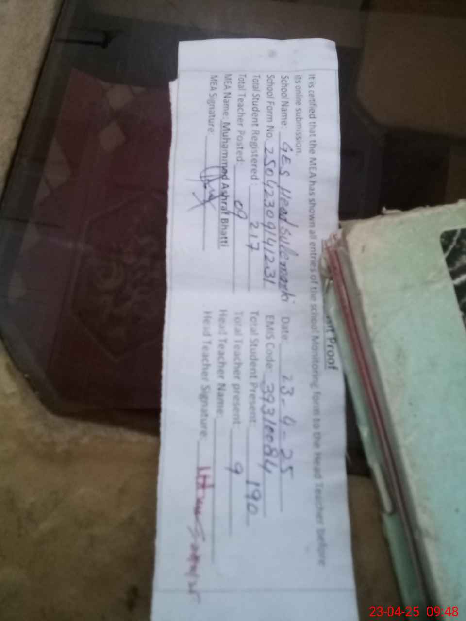| Attendance Register | Head Teacher | MEA with School | Visit Proof |