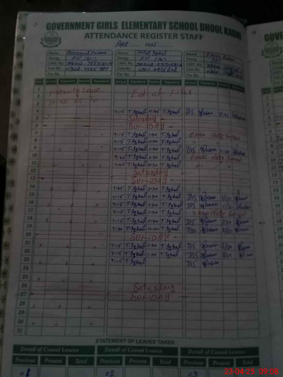 | CNIC | Full Name | Designation | R/C | Absence During Last Calender Month |