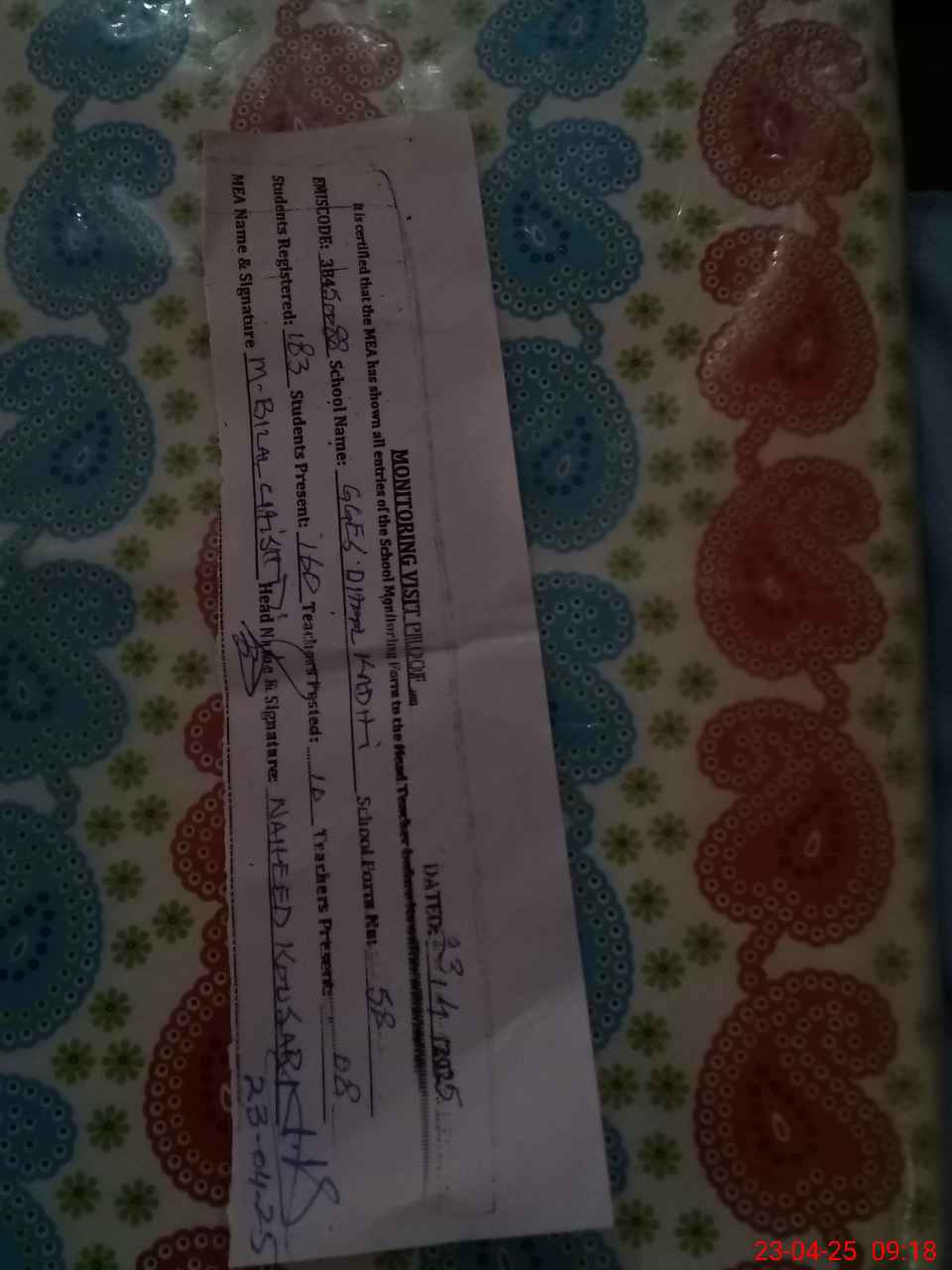 | Attendance Register | Head Teacher | MEA with School | Visit Proof |