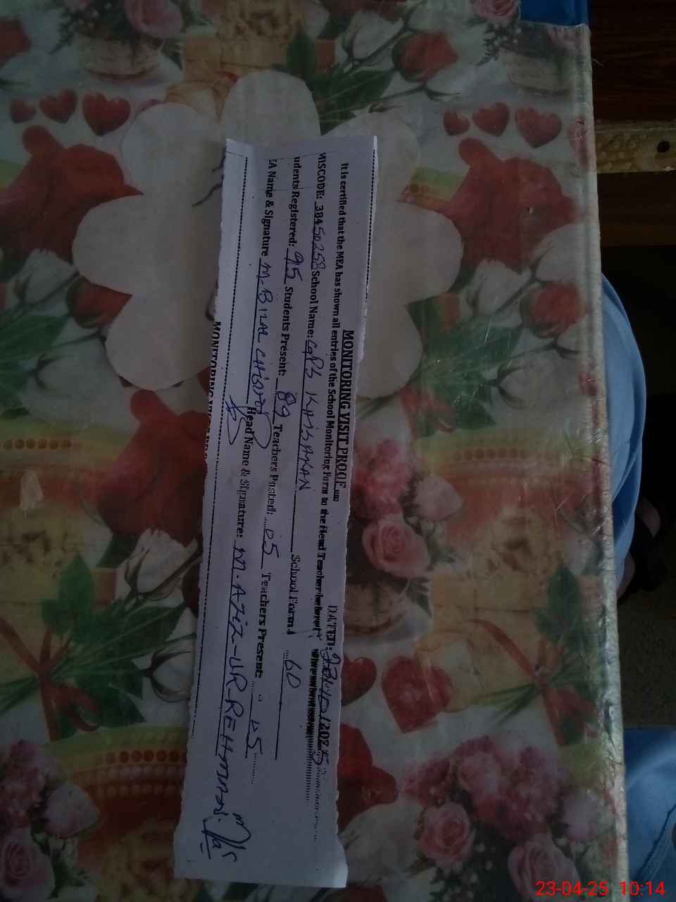 | Attendance Register | Head Teacher | MEA with School | Visit Proof |