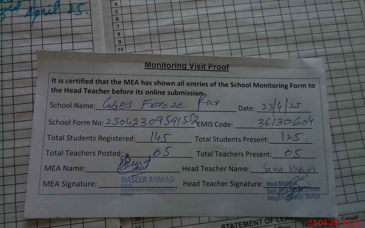 | EMIS Code: 36130604 | Name of School: GGES FEROZ PUR MULTAN | |||