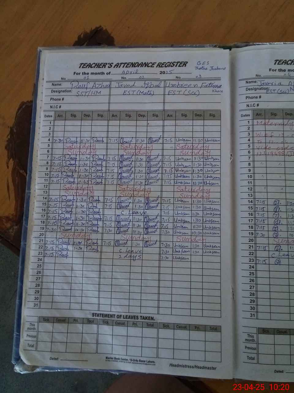 | Leave | Duty | Absent | Maternity | Medical | Ex- Pak |