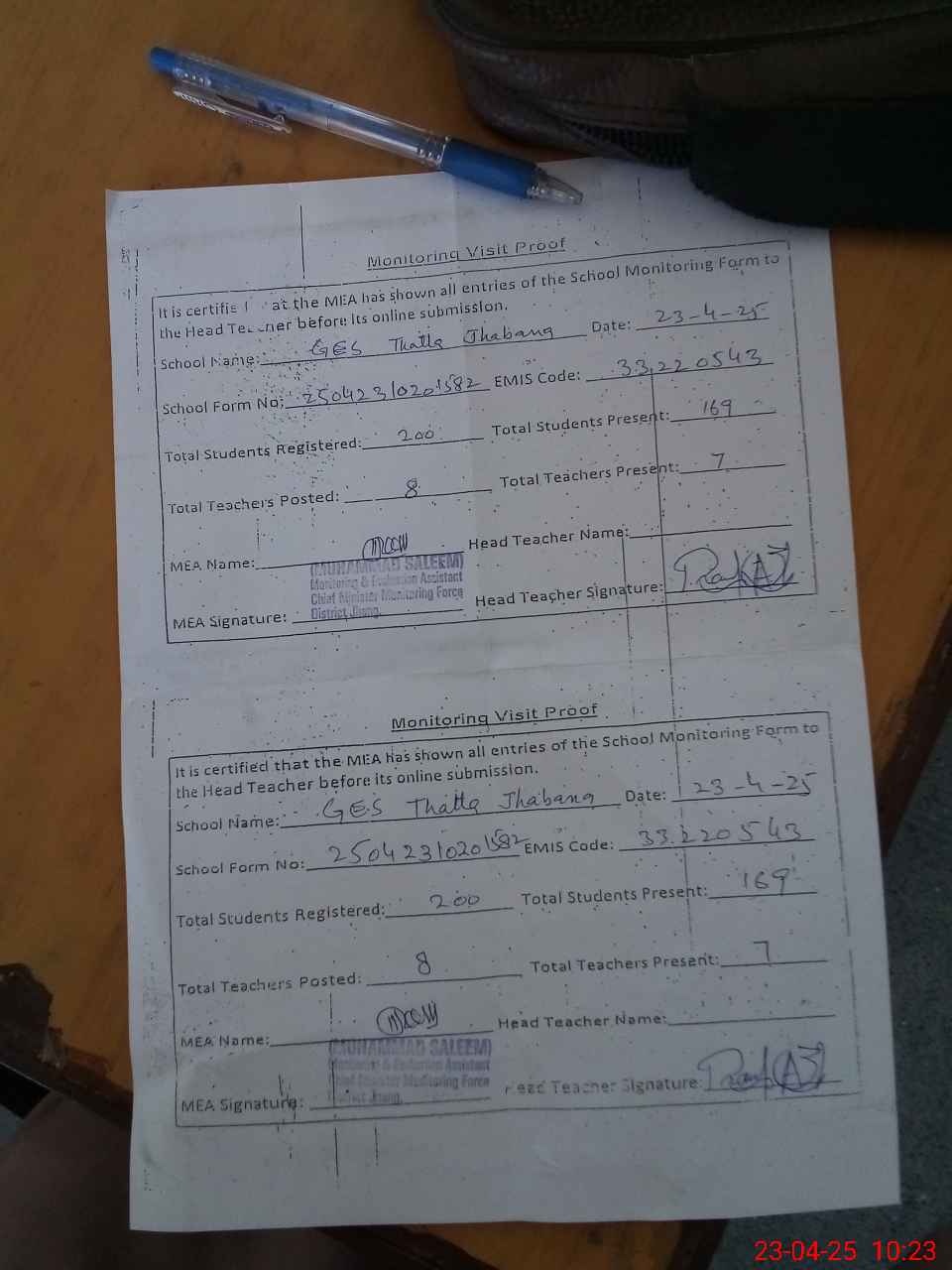 | Attendance Register | Head Teacher | MEA with School | Visit Proof |