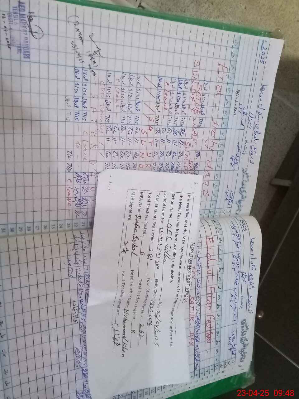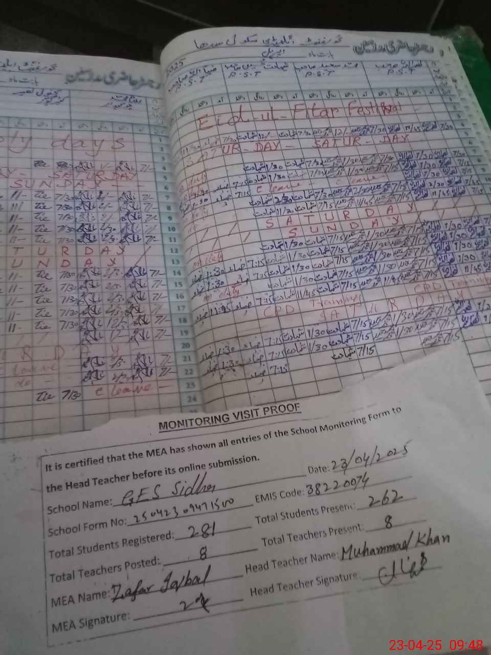 | Attendance Register | Head Teacher | MEA with School | Visit Proof |