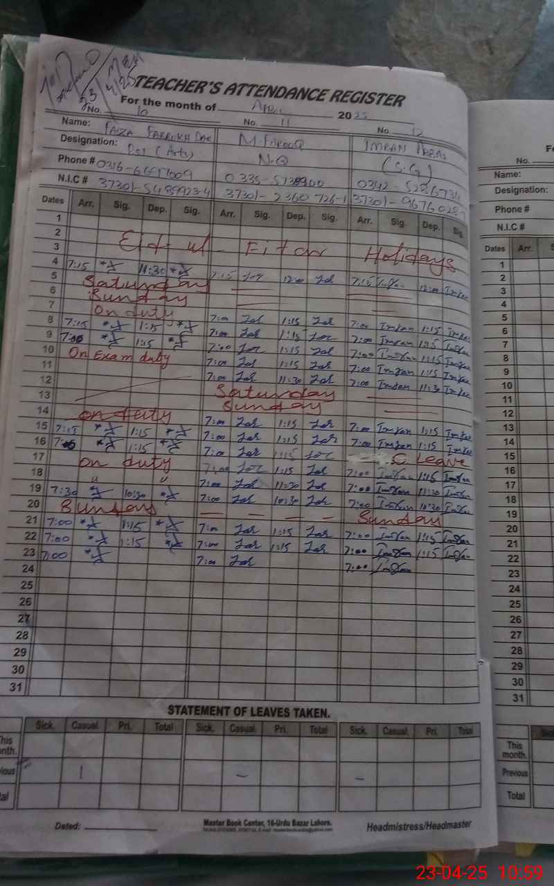 | CNIC | Full Name | Designation | R/C | Absence During Last Calender Month |