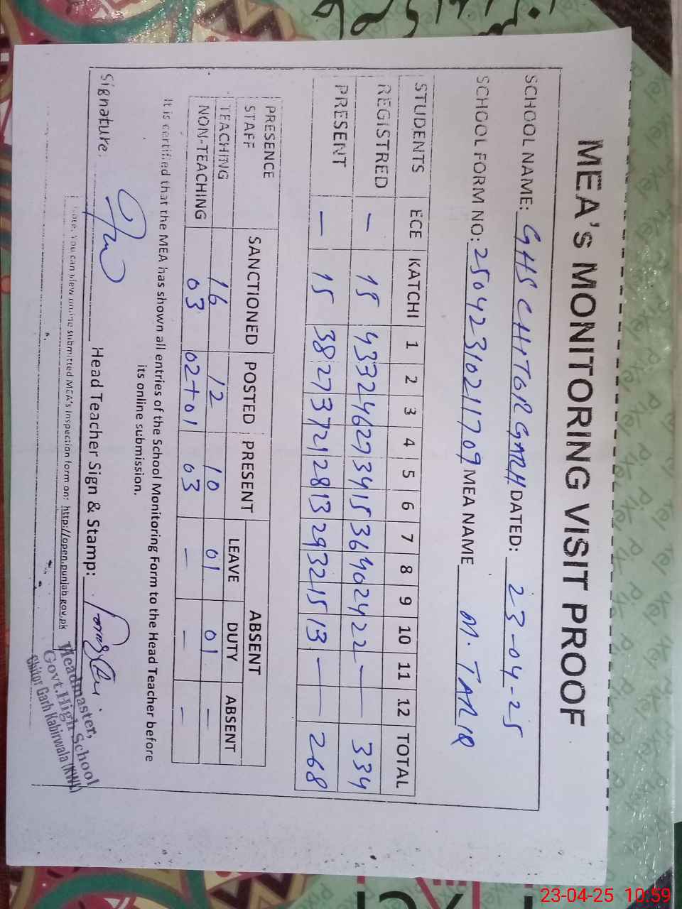| Attendance Register | Head Teacher | MEA with School | Visit Proof |